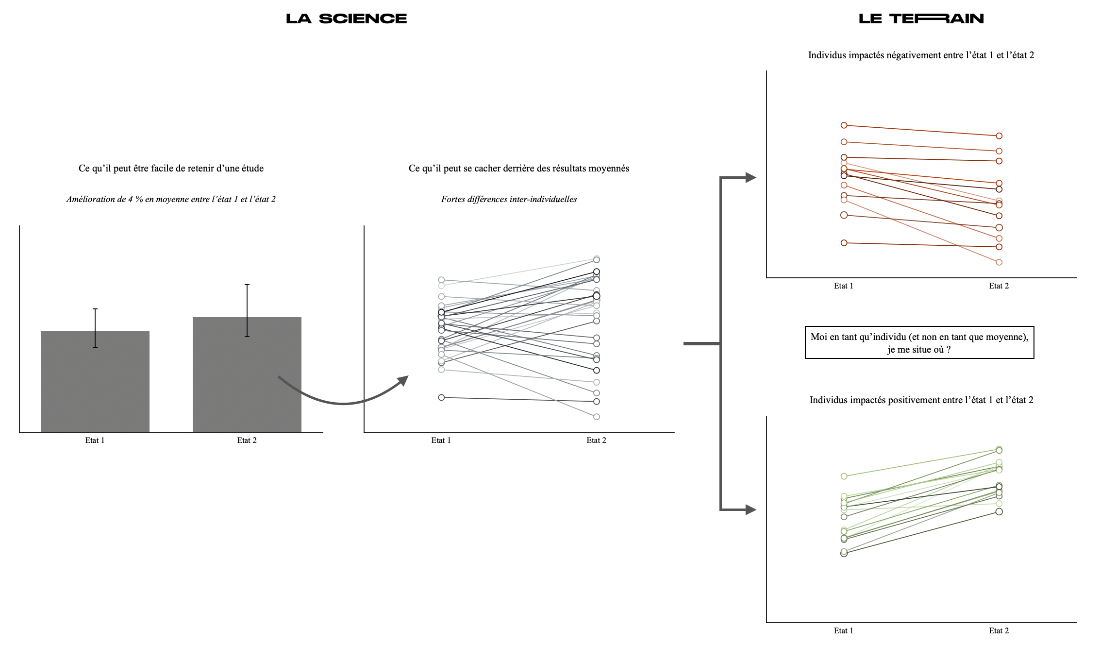 Dans un monde où la science prend une place grandissante, il est tentant de considérer un résultat scientifique comme une vérité absolue, sans toujours le confronter à la réalité du terrain. Pourtant, une tendance moyenne observée sur un groupe d’individus ne reflète pas nécessairement la complexité de chaque athlète. Ce qui fonctionne en moyenne ne fonctionne pas pour tous. Cela est vrai dans de nombreux domaines : effets de la caféine, réponse à l’altitude, distribution de l’intensité, définition des seuils en pourcentage de VMA, chaussures carbone…